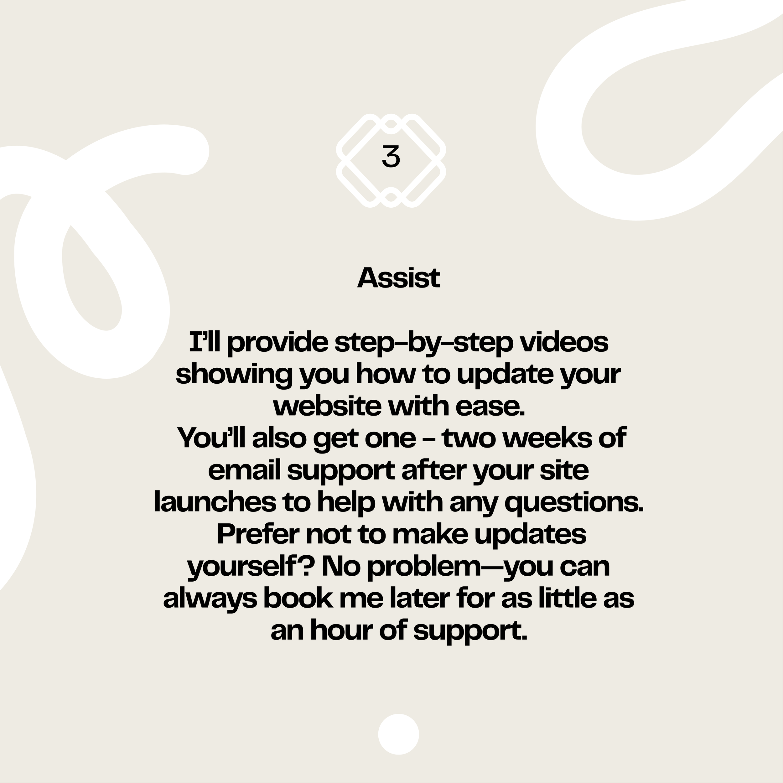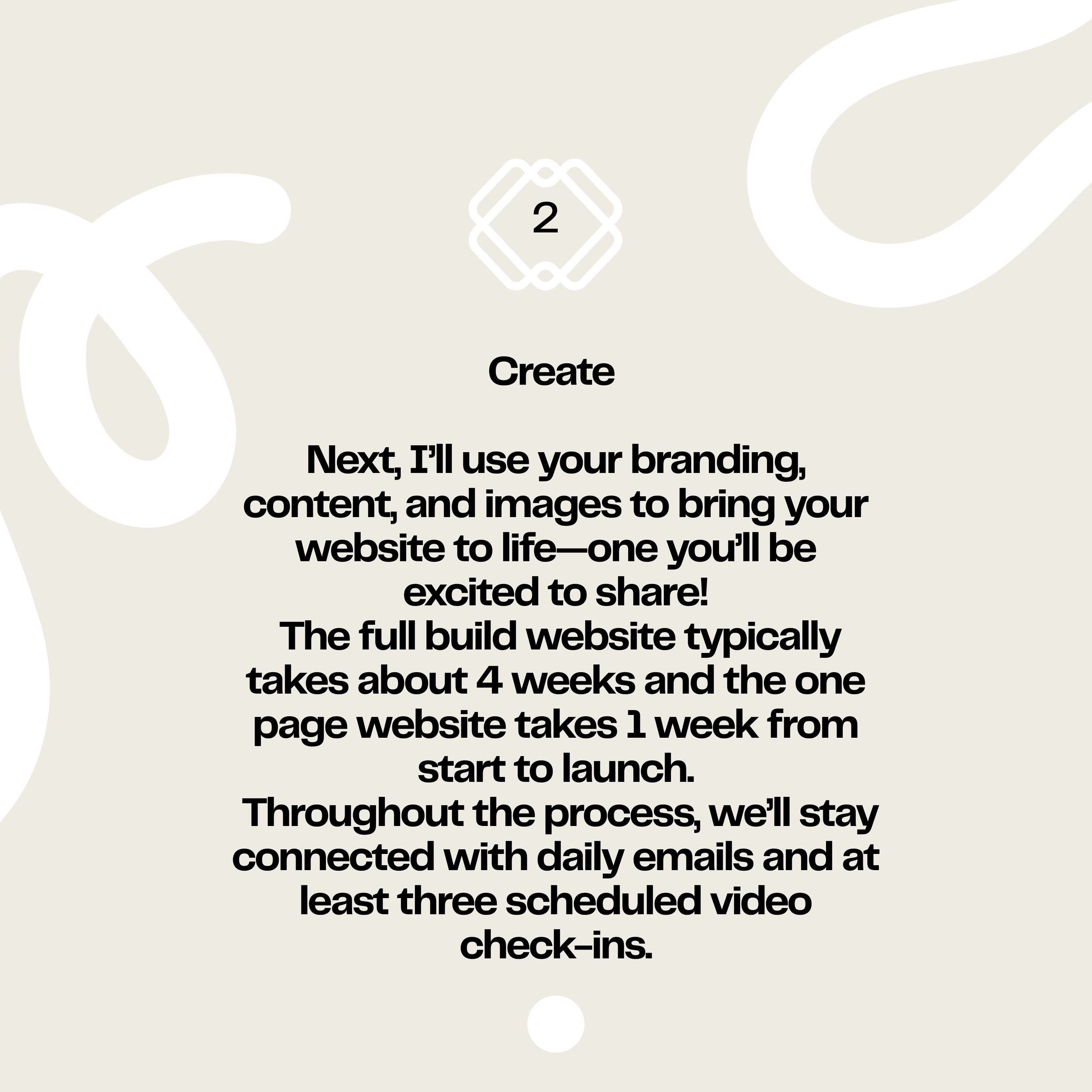 You’ll provide the copy for your website. Many clients choose to write it themselves (and I’m happy to do light copy-editing during the build). If you’d like extra support, I can make recommendations if you want help with this step.